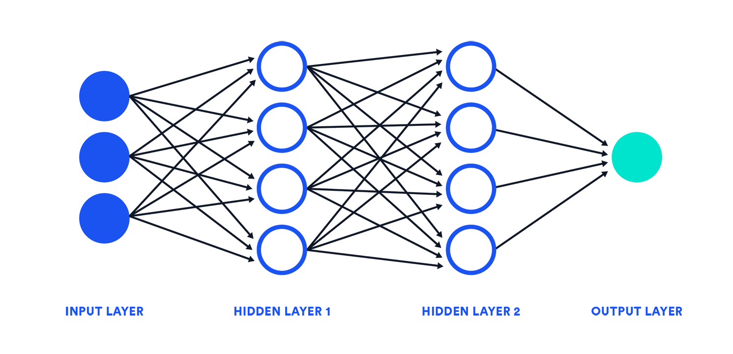 - Hidden layer(s): These layers of neurons are for processing the data. These layers will have corresponding weights, a bias, and an activation function applied to the data that they are fed, unlike the input layer. There’s a bit of artistry and science involved in deciding how many hidden layers to use. For now what’s important to understand is that the data can go through one or more layers of understanding. Having more than one hidden layer, is what makes an NN “deep,” hence the term “deep learning.”
